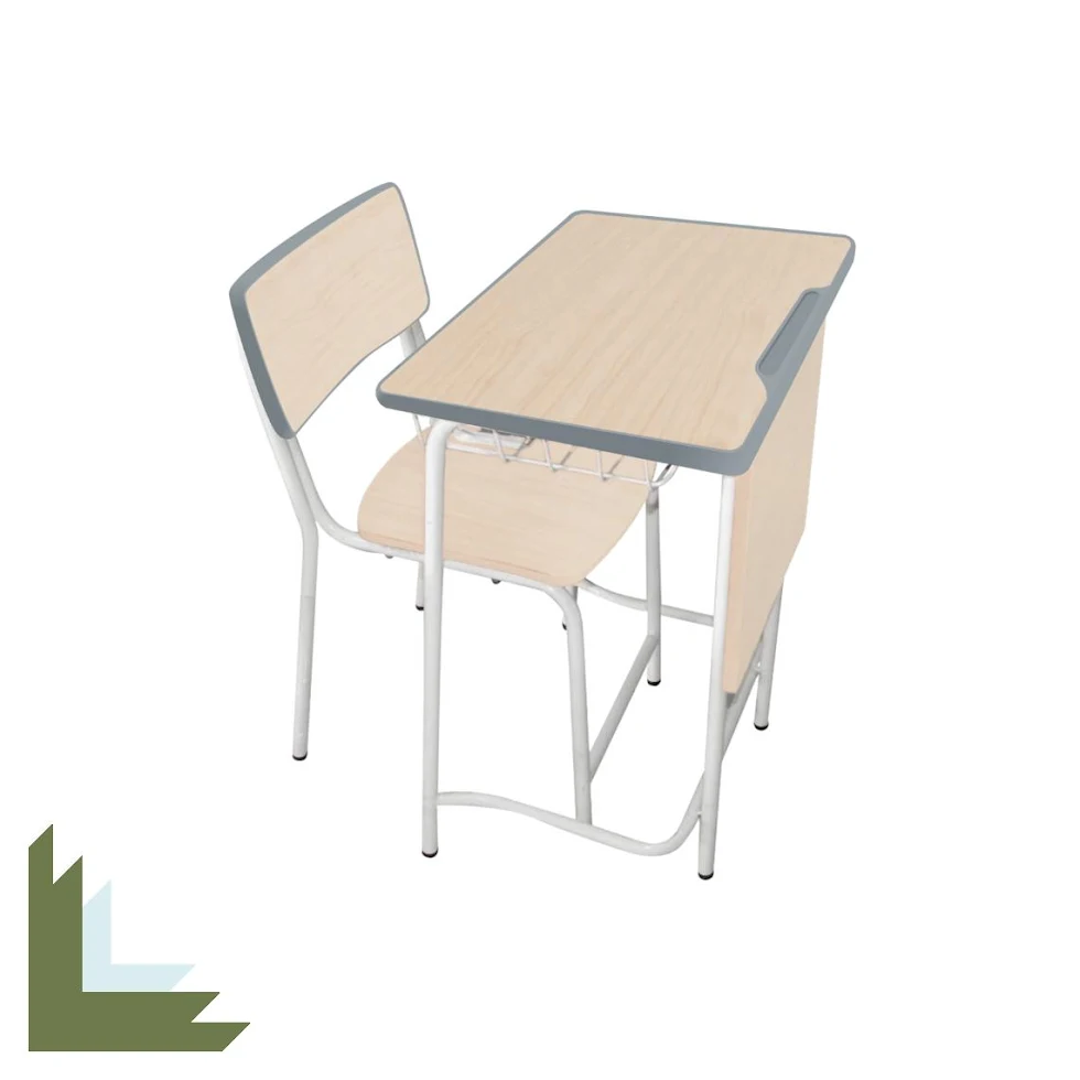 Material metal dan kayu yang digunakan membuatnya tahan lama dan mudah untuk dibersihkan. Terdapat pengait di sisi meja yang memudahkan siswa untuk menggantungkan tas atau jas mereka. Selain itu, kaitan pada meja menjadikannya lebih stabil dan kokoh sehingga siswa dapat belajar dengan nyaman.